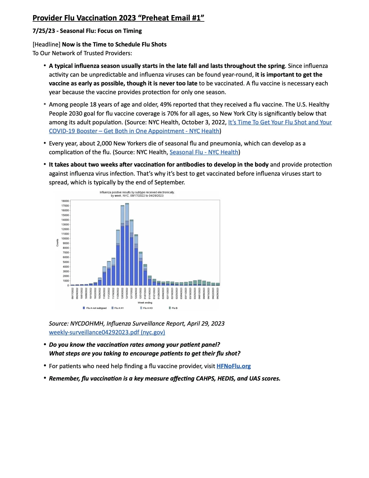 Each year Healthfirst encourages its members to get their flu shots. This serves both the population health and Healthfirst’s quality scores. In 2023, I proposed supporting the member effort with a coordinated provider focused promotion effort as well. The effort was conservative, but had a noticeable effect on our quality scores. For 2023, I proposed focusing the effort on areas of low vaccine adherence and targeting ethnic groups that showed the greatest reluctance to vaccinate. The results were positive and helped Healthfirst rise to a 4.5 Star rating from CMS.