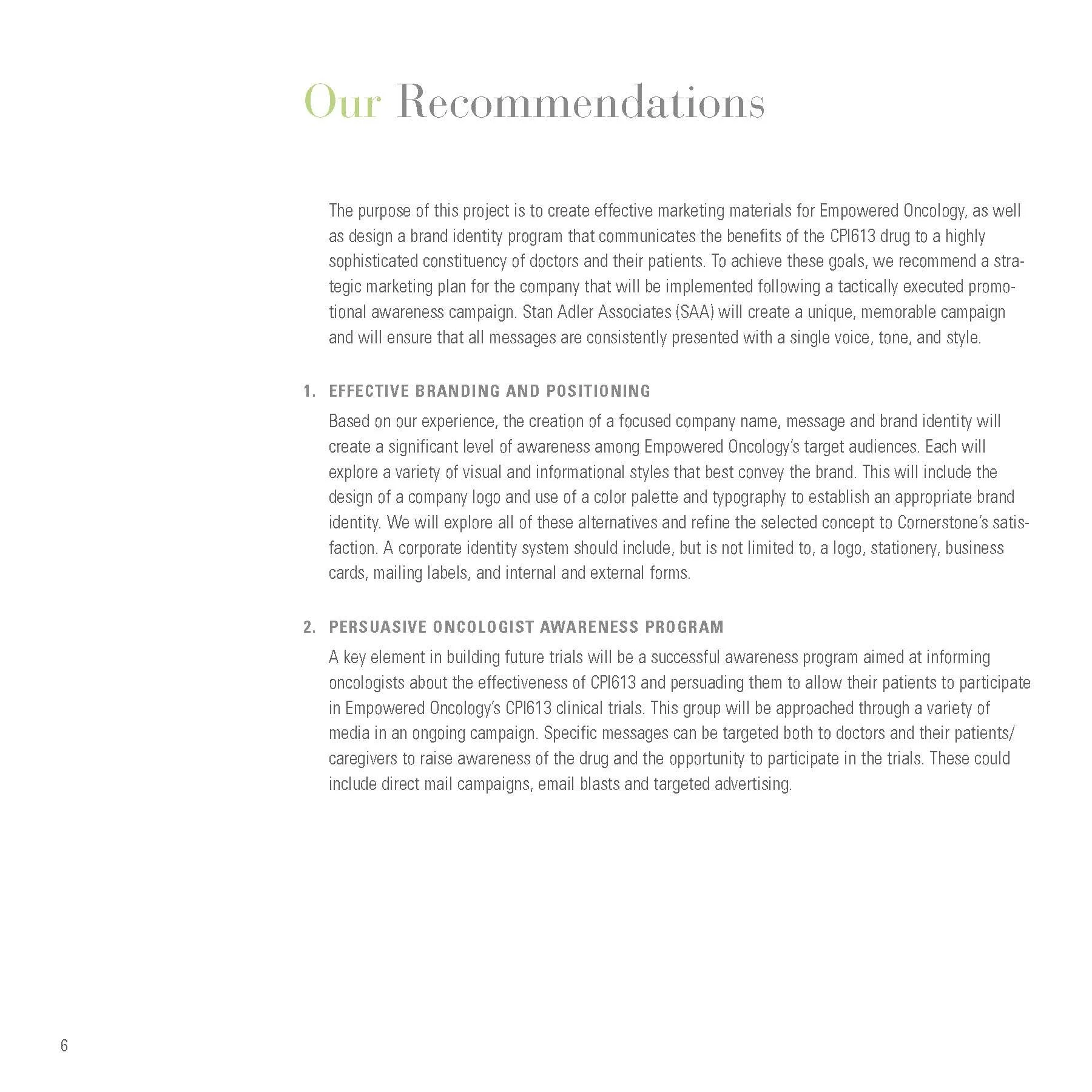 Cornerstone Pharmaceuticals, Inc., is a privately held pharmaceutical company dedicated to the discovery and development of cancer therapies. They intended to trial their first major drug development through a wholly-owned subsidiary, allowing physicians to administer the drug and monitor the progress of their own patients, a unique approach at the time (2009). The attached proposal to the company contains Situation Analysis, Strategic Objectives, and Recommendations pages which double as a project brief for the entire initiative. The drug, CPI613, remains in testing today.