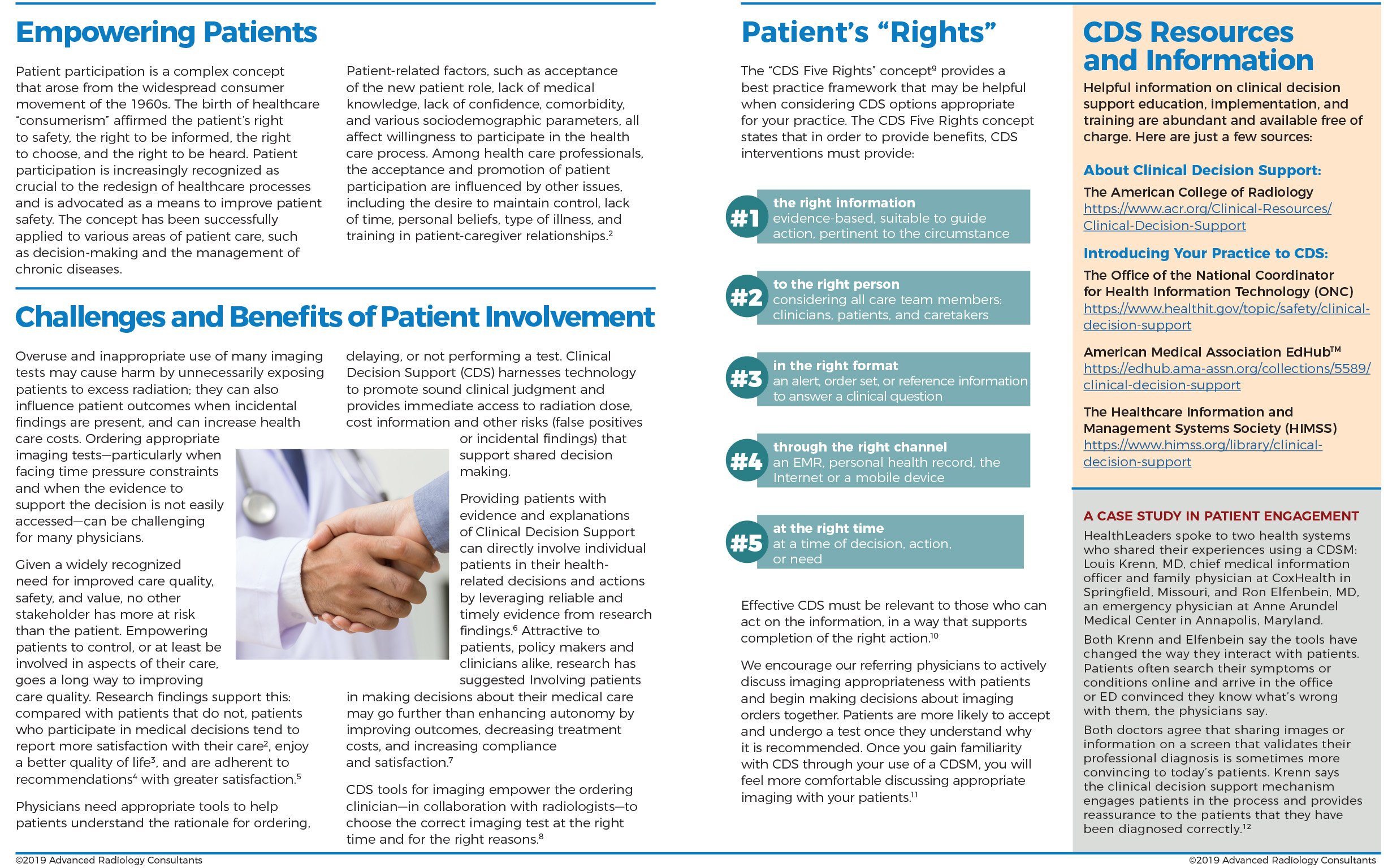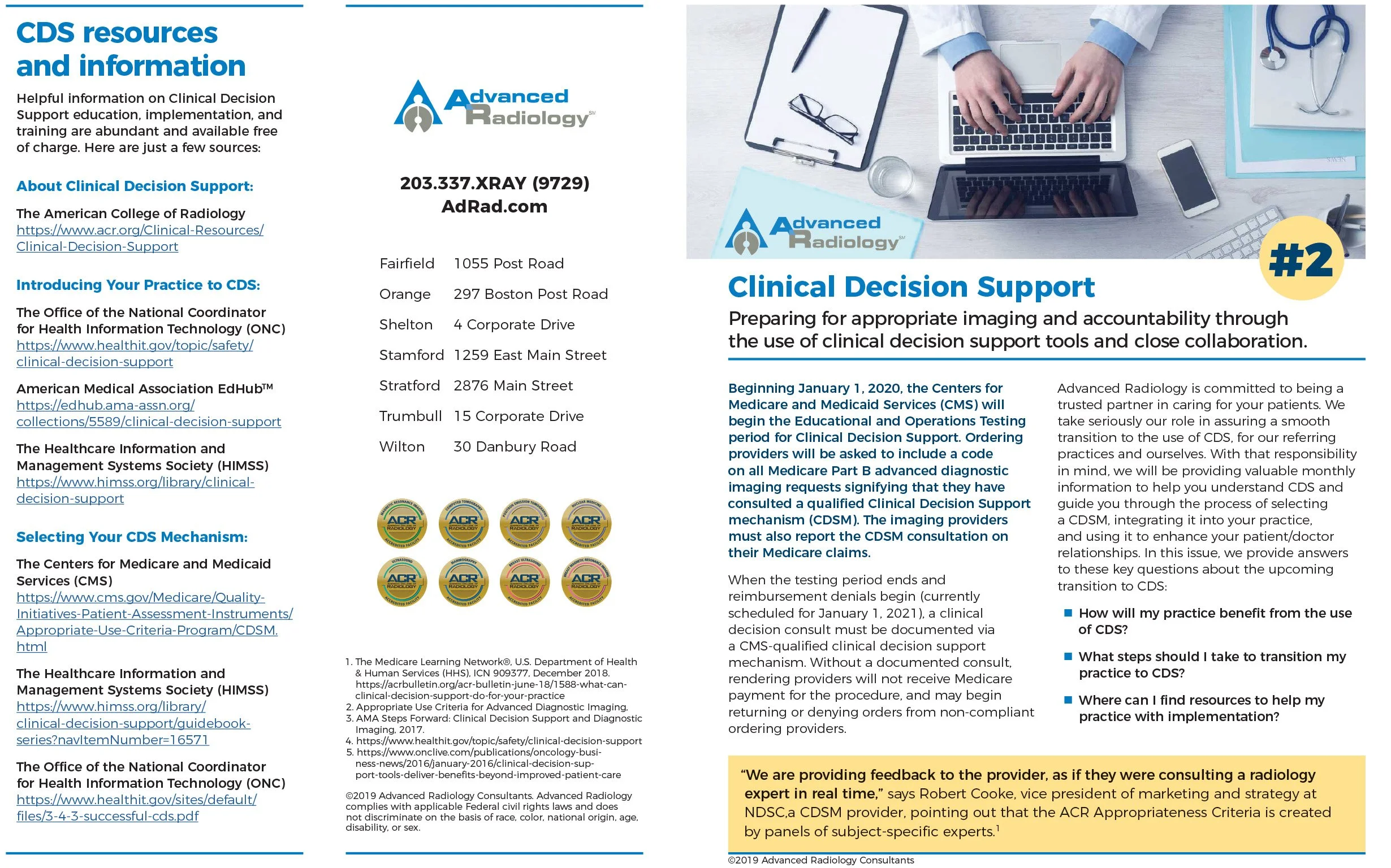 To mitigate these risks, maintain healthy relationships, and establish an ongoing presence in our referring physicians’ offices, Advanced Radiology developed our Clinical Decision Guides. Working with our Practice Liaisons, IT Director, and Revenue Cycle Manager, I was able to compile lists of the most frequently prescribed imaging series in each of the three major modalities (MRI, CT, Ultrasound). For each exam, I included the most common reason, whether or not the exam required contrast, and the correct code for that specific exam. Each modality was represented by a multi-page document, laminated and bound on a metal ring, and delivered in-person by our Practice Liaisons.