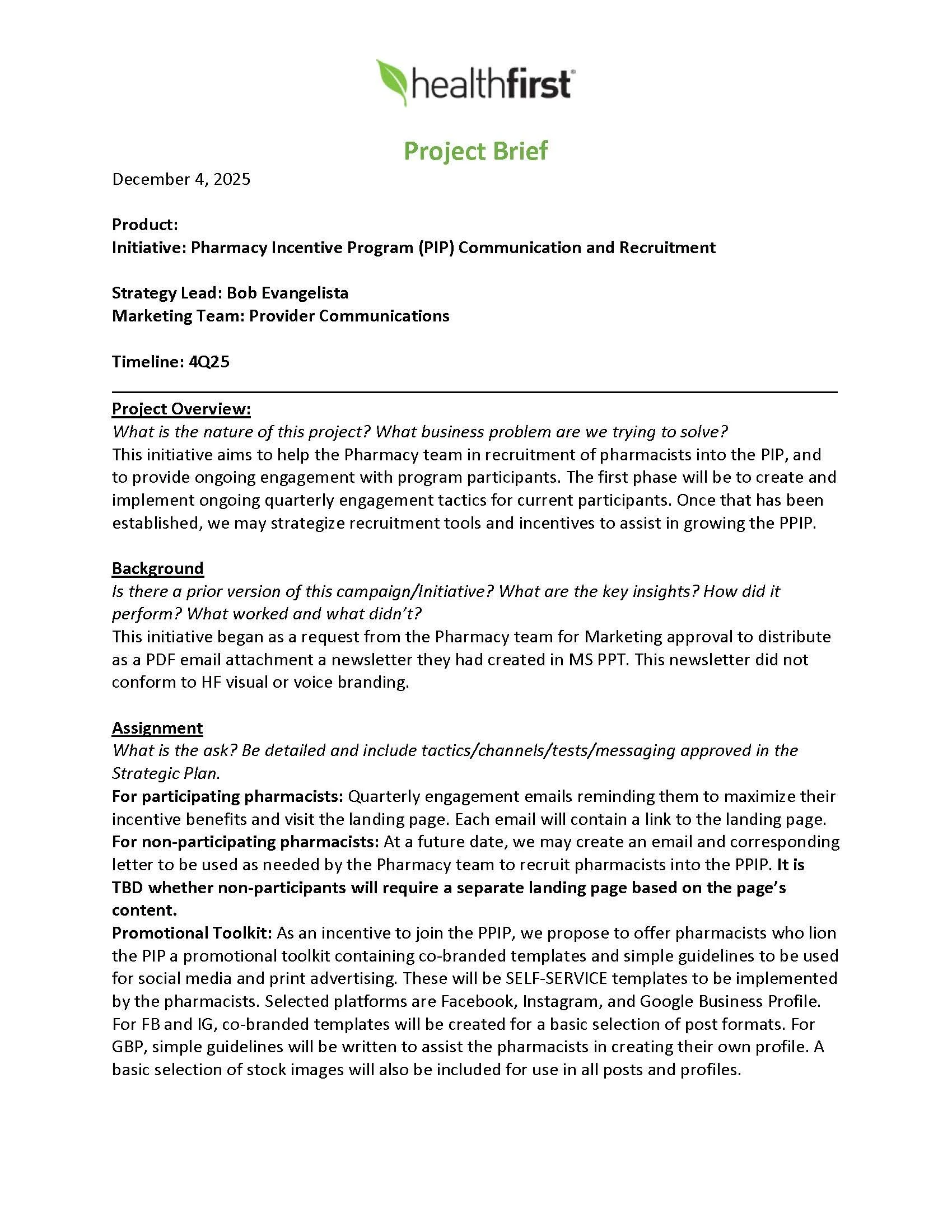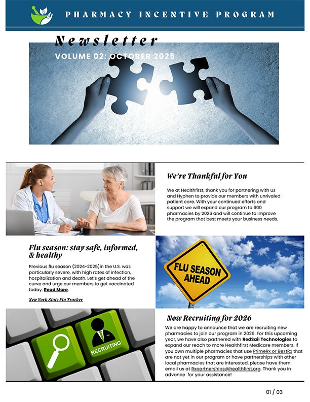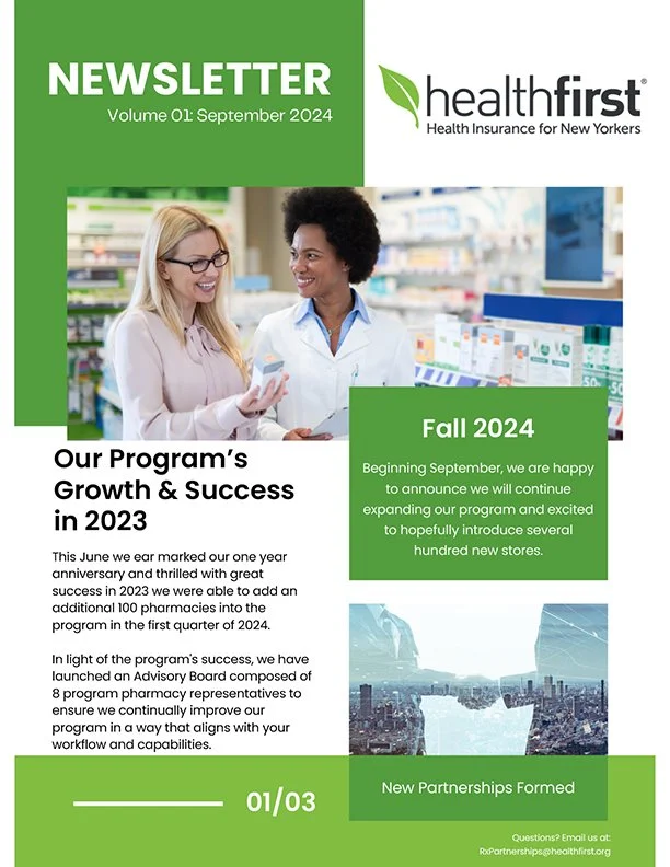 After evaluating the initial two newsletters created by my Pharmacy team (shown below), I directed my Creative team to develop a digital landing page using the same content, and which aligned with our corporate brand standards. This option addressed our need for greater engagement by facilitating a quarterly email announcing updates, permitted for scalability to any number of participants, and allowed for future updates including password access and display of pharmacist-specific performance data.