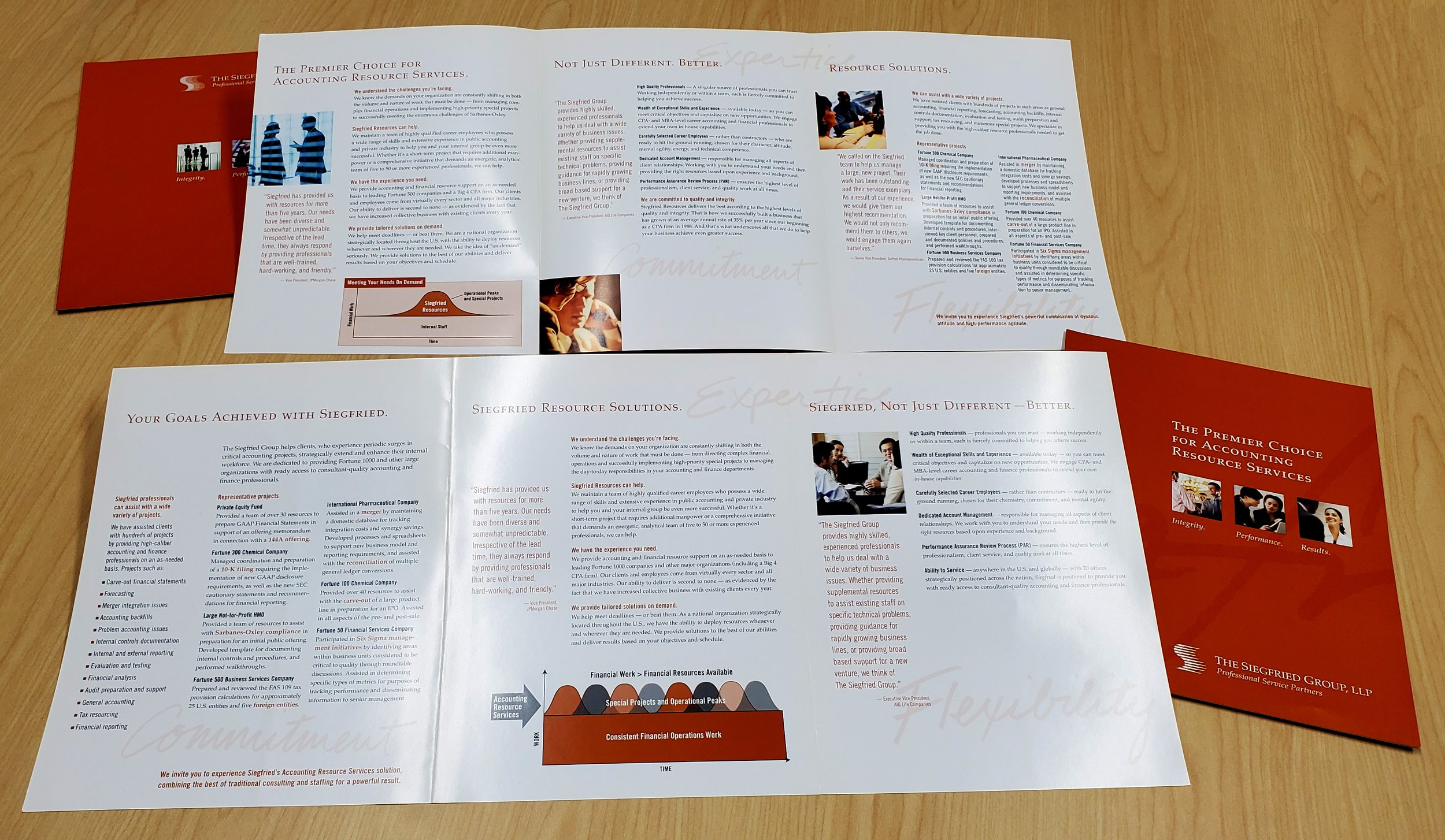 While still offering a list of the many values of the Siegfried services, the new version of the brochure focuses more on illustrating how the company can assist in several specific industries. The most common client response to a Siegfried proposition was to ask, “I see you have a wealth of accounting experience, but can you help my business specifically?”