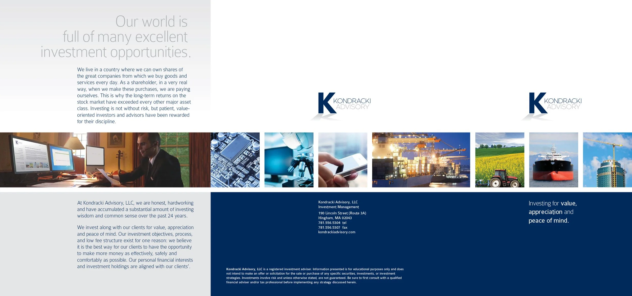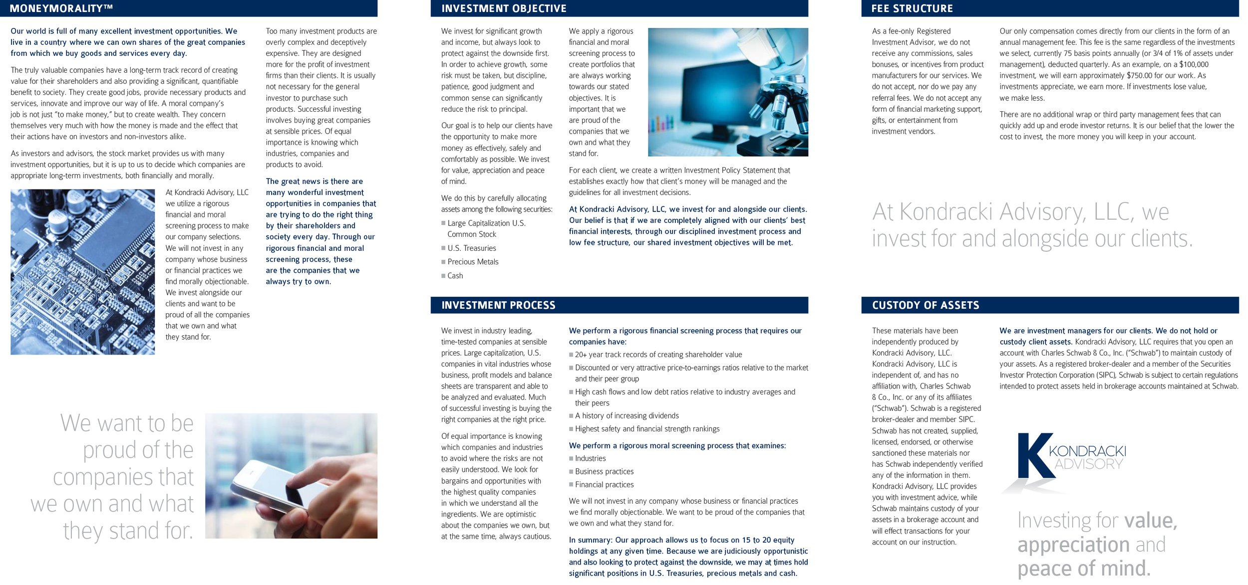 Chris Kondracki opened his own investment management firm in 2012. As has been my experience with many financial professionals, their expertise lies less in creative endeavors and more in working with numbers. I was able to work with Chris to develop descriptions of his investment philosophy. MONEY MORALITY, which I highly respect.
