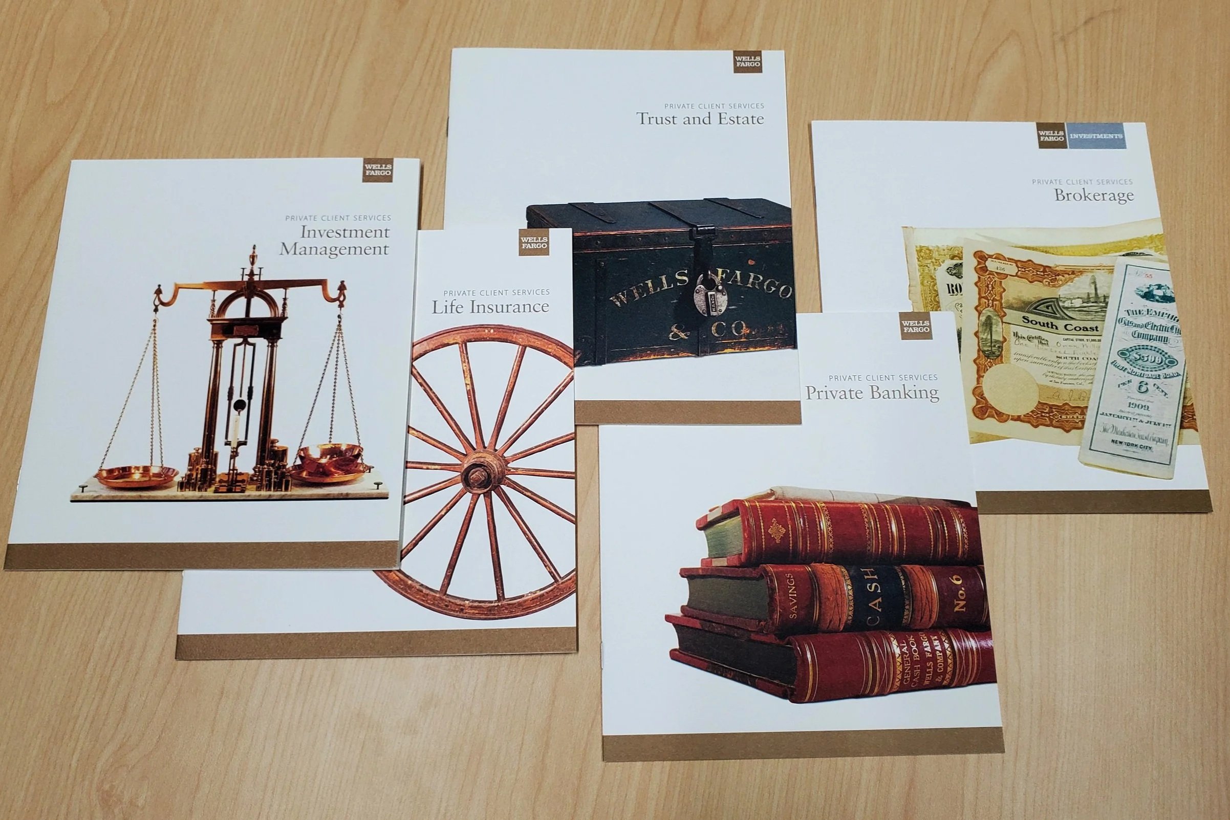 Turning from weaknesses to strengths, I will again point to Wells Fargo Private Client Services material as an entirely successful design. The engagement of the client and their belief in our strategy formed the foundation for this success. Their trust in us opened doors to their museum collections, helped us form relationships with their curators who enthusiastically participated in photo shoots. Their product specialists were deeply involved in writing and fine tuning copy to the “stage” theme, ensuring appropriate and powerful messaging. That collaborative spirit in turn empowered our designers to fully immerse them selves in the project and deliver a superior product, right down to the real leather strap securing the entire collateral package.